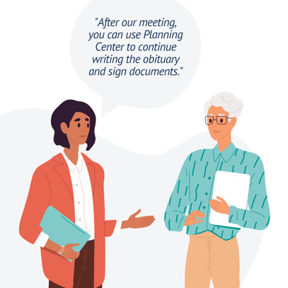 Third, funeral directors use the Planning Center as a follow-up tool to collaborate with families on the obituary and other essential items. Other funeral directors have shared that they use the Planning Center on a large screen and fill in the information with the family so they can review it later. For example, you could say: